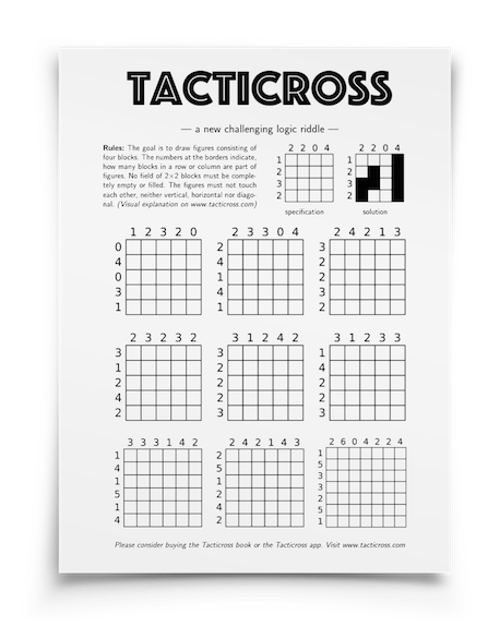 Tacticross is the new challenging logic puzzle game which keeps your brain sizzling for hours! If you love games like Picross, Nonogramm, Hanjie, Griddlers, Campixu or Sudoku and are looking for an additional challenge you will adore Tacticross!